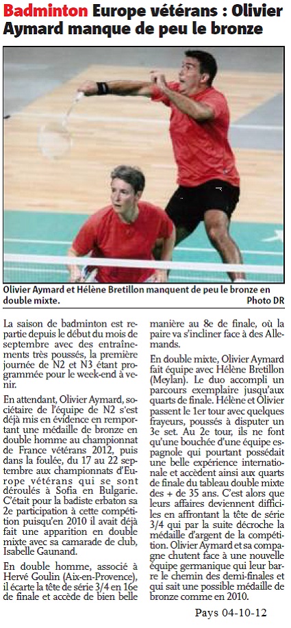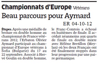 C’est en mixte avec Hélène Bretillon de Meylan, qu’il fait son meilleur résultat. Ils passent le 1er tour avec quelques frayeurs et sont poussés au 3ème set par leurs adversaires. Au second tour ils ne font qu’une bouchée d’une paire espagnole et accèdent au 1/4 de finale du tableau de mixte + de 35 ans. C’est alors que les affaires se corsent face à la tête de série 3/4 (qui décroche la médaille d’argent à l’issue de la compétition). Et ce sont de nouveau des germaniques qui frênent la progression de nos français.